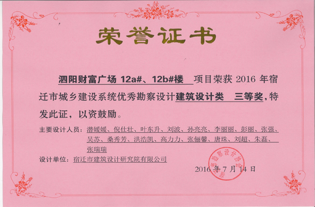 1、泗陽(yáng)財(cái)富廣場(chǎng)12a#、12b樓項(xiàng)目中獲建筑設(shè)計(jì)類(lèi)三等獎(jiǎng)