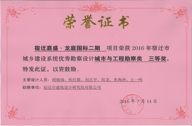 2、宿遷嘉盛‘龍庭國(guó)際二期項(xiàng)目中獲城市與工程勘察類(lèi)三等獎(jiǎng)